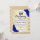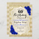 Invitación de cumpleaños número 60. Diseño elegante en dorado y azul real. Cuenta con rayas doradas con brillo falso, rosas zafiro en fuente de letra estilizada y confeti. Perfecto para una fiesta de cumpleaños glamorosa.