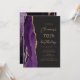 El borde izquierdo de esta elegante invitación moderna para una fiesta de cumpleaños presenta un borde de ágata acuarela púrpura recortado con brillo falso dorado. El texto personalizable combina letra script dorada y fuentes sans serif sobre un fondo negro de pizarra. La parte posterior presenta un diseño de ágata púrpura y dorada a juego.