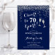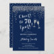 70.ª Invitación de cumpleaños. ¡Saludos A 70 Años! Diseño elegante en marina, blanco y plateado. Incluye gafas de champán, letra de guión y confeti. Perfecto para una elegante fiesta de cumpleaños. Personaliza con tus propios detalles. Se puede personalizar para mostrar cualquier edad.