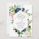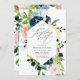 Invite a sus invitados a la fiesta de cumpleaños número 90 con estilo con esta elegante invitación de cumpleaños floral personalizada con rosas de acuarela pintadas a mano en azul marino y rosa suave con vegetación y tipografía negra moderna. Personalice todos los detalles de su fiesta con tipografía de escritura negra. La parte posterior de la tarjeta tiene un patrón de rosas de acuarela a juego. Diseñado por Susan Coffey.