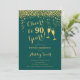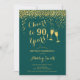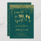 Invitación de cumpleaños 90. ¡Un brindis por 90 años! Diseño elegante en verde esmeralda y dorado. Cuenta con copas de champán, letra script y confeti. Perfecto para una fiesta de cumpleaños número noventa con estilo. Personaliza con tus propios detalles. Se puede personalizar para mostrar cualquier edad.