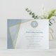 Esta invitación de aniversario de bodas de 50 años de estilo geométrico moderno y diseñado de manera sencilla, presenta un tema de color azul polvoriento con elementos caligráficos, acentos de marco dorado asimétrico y apariencia de textura de mármol - personalice fácilmente los elementos de texto para cualquier aniversario o celebración de cumpleaños - por katz_d_zynes