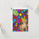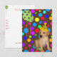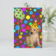 Invitación Niña o Niño Cumpleaños Fiesta Globos Verdes y Morados con Manchas, Manchas Multicolores en Cachorro Labrador Marrón con Gorro de Fiesta de Manchas Amarillas y Negras.