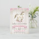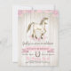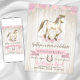 Tarjetas de invitación de cumpleaños de caballo de acuarela para niñas con dulce caballo en un fondo floral de acuarela rosa y madera rústica. Esta invitación de cumpleaños de caballo para cualquier número se personaliza fácilmente para su evento simplemente agregando los detalles de su evento.