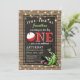 Invitaciones de cumpleaños con tema de pesca para celebrar que tu hijo cumple un año. Esta invitación presenta un fondo de madera rústica, un centro de pizarra, un pez verde lindo, un flotador de pesca y una plantilla moderna de celebración de cumpleaños que es fácil de personalizar.