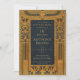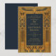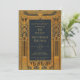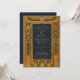 Esta elegante invitación vintage azul y dorada para una fiesta de cumpleaños con tema de Egipto tiene un marco dorado con decoraciones del antiguo Egipto: escarabajo alado sobre el texto y flores de loto en los lados y abajo. El texto es dorado, como el marco, el fondo (y la parte trasera) es azul marino.