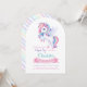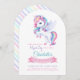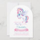 Invitación a una mágica fiesta de cumpleaños con un adorable unicornio con alas en las nubes sobre un fondo arcoiris.