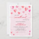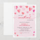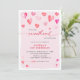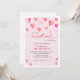 Elegante invitación de cumpleaños infantil con caligrafía roja y rosa "nuestro pequeño corazón está cumpliendo un año".