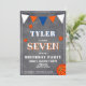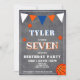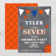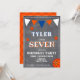 Invitación de cumpleaños de baloncesto moderna para niños en pizarra. Tarjeta de cumpleaños de baloncesto adorable. El diseño tiene pelotas de béisbol y banderas de bunting en colores naranja, blanco y azul sobre un fondo de pizarra. Personalice esta invitación de cumpleaños con el nombre de un niño, edad y personalice todos los datos en la invitación. Ideal como invitación de cumpleaños para un niño que ama el baloncesto o cualquier otro deporte.