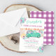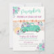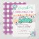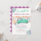 Invitación de cumpleaños de camioneta antigua púrpura y turquesa de niña agricultora con acuarela, flores de otoño en el parche de calabaza.