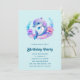 Invitación de cumpleaños con una ilustración adorable. Un delfín azul y morado rodeado de hermosas flores submarinas.