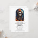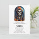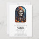 Invitación de cumpleaños con una ilustración de un esqueleto que lleva una chaqueta con capucha y un sombrero de bruja naranja encima. Rodeado de calabazas lindas y espeluznantes. Una luna brillante en la parte de atrás con un solo murciélago volando cerca. Diseño divertido de otoño de Halloween o para regalos de fiestas o negocios con temática de muerte.