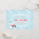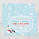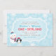 La invitación de cumpleaños número uno de "ONEderland" invierno mágico cuenta con un muñeco de nieve feliz y un pingüino ártico lindo con el número uno (1) en su barriga con un diseño de marco decorativo y patrón de fondo de copos de nieve. Colores azul hielo, turquesa, rojo y blanco.