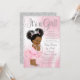 Invitación de cumpleaños de princesa africana por correo con adorable princesa bebé con hermoso cabello afro que lleva un tutú rosa con volantes y corona plateada con un collar de perlas sobre un hermoso fondo rosa y plateado. Esta invitación de cumpleaños por correo se personaliza fácilmente para su evento agregando sus detalles en el estilo de letra y color y redacción de su elección.