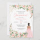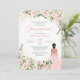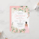 Invitación a la quinceañera con delicadas rosas rosas y blancas de color rosa y flores ramos con acentos dorados y un chica con un elegante vestido de bola de princesa. Consulte la tienda para ver esta invitación con chicas de diferentes colores de cabello y tonos de piel.