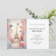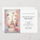 Una invitación de cumpleaños con una elegante imagen de la torre Eiffel rodeada de mariposas de bonito y delicadas flores de jardín.