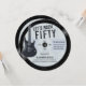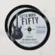 Una elegante plantilla de invitación a la fiesta de cumpleaños con temática musical, con forma de disco de vinilo con notas musicales y una guitarra, con un fondo azul y gris texturado y el título "Vamos a rodar 50 años". Puede editar esta plantilla por completo. ¡Una invitación perfecta para una fiesta de cumpleaños para un hombre que ama el rock, la música y las guitarras, en su 50° aniversario! Papá, marido, abuelo...