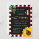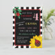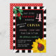 Invitación linda de la fiesta de cumpleaños de la mariquita con una mariquita que se sienta en una rama verde de hojas y otra en un girasol amarillo brillante. Añada el nombre del chica del cumpleaños en amarillo y su edad en rosa. La fraseología de la invitación es enmarcada por una frontera roja y rayas blancos y negros, mientras que la parte posterior ofrece lunares rojos y blancos.
