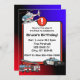 Invitación de cumpleaños de los vehículos de emergencia - policía, camión de bomberos y helicóptero.