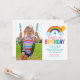 Esta alegre invitación de cumpleaños con tema de arcoíris presenta un fondo blanco crujiente con un arcoíris brillante, sol dorado y nubes esponjosas que arcos sobre un espacio para la foto de tu hijo. La letra "Cumpleaños" en negrita y colorida del arcoíris hace una declaración divertida, mientras que la tipografía script y de impresión muestra los detalles de la fiesta. Todo el texto es totalmente personalizable para que coincida con el día especial de tu pequeño.