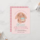 Invitación de cumpleaños de niñas con conejo de peluche lindo y detalle de gingham rosa, y la frase “algún conejito está cumpliendo..” Perfecto para un tema de cumpleaños de niñas inspirado en conejitos, bosque o nursery acogedor.