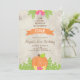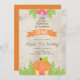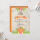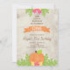 Esta linda invitación para la fiesta del primer cumpleaños presenta un gráfico de colores brillantes de una calabaza sobre un fondo rústico. El diseño está acentuado con flores rosadas para hacerlo perfecto para la niña.