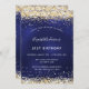 Una invitación moderna, elegante y glamurosa para una fiesta de cumpleaños número 21 (o cualquier edad). Un fondo azul marino, decorado con un polvo falso purpurina dorado. El color azul es desigual. Personalice y agregue su nombre y detalles del fiesta.