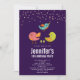 Una invitación de cumpleaños con un trío de pájaros lindos y caprichosos dibujados a mano. 2 de los pájaros están parados juntos con algunos pequeños pinos verdes entre sus patas. Otro pájaro azul vuela en el aire entre ellos. Confeti dorado rosa falso en la parte superior. Puesto en un fondo púrpura.
