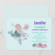 Una invitación de cumpleaños con una ilustración adorable. Diseñada con una linda chica sirena montando un delfín feliz. Un pequeño amigo medusa los acompaña. Decorado con pequeñas salpicaduras de brillo dorado falso.