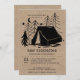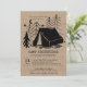 Invitación rústica de camping totalmente editable - perfecto para niños, cumpleaños de adolescentes y adolescentes, salidas a campamentos, senderismo y temas de barbacoa. El diseño tiene un dibujo de un doodle de silueta de una tienda de campaña en un bosque de pinos, bajo la luna y las estrellas. Está escrito en tipografía de máquina de escribir vintage y tipografía moderna en mayúsculas sobre el fondo de la textura del aspecto de papel kraft.
