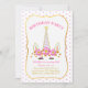 Hermosa tarjeta de invitación de cumpleaños de unicornio, flores y confeti con aspecto metálico dorado. Todo el texto está listo para ser personalizado.
