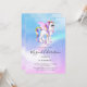 Invitación de cumpleaños con imagen de un unicornio con ojos azules grandes y melena y cola de arcoíris. Kawaii lindo.