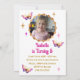 Un unicornio mágico, de acentos púrpura, rosa y dorado, rodeado de flores, mariposas y chispas. Tema de cuento de hadas para la fiesta de cumpleaños de una niña. Agregue la foto de un niño en la parte posterior del área de personalización.