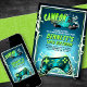¡Tu jugador se ha estabilizado! Este diseño de cumpleaños de camiones de videojuegos tiene un estilo dramático con relámpagos, un bus de fiesta de jugadores y un controlador de consola para preparar el escenario para una gran celebración de camiones de juego. El esquema de color verde verde azulado y limo y los tipos de letra negrita son perfectos para jugadores de cualquier edad. Descarga tu copia digital hoy para presionar el inicio en el mejor cumpleaños de la historia!