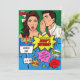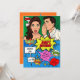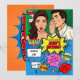 Diseño de invitación de cumpleaños divertidos con un estilo de arte pop / cómic con colores vivos y audaces y un hombre susurrando en el oído de una mujer.