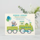 Envía a los invitados un boleto para viajar con esta divertida invitación de cumpleaños de tren choo choo sobre un fondo azul con lunares. Un adorable conductor de osito de peluche agita desde una brillante locomotora que arrastra un vagón ferroviario festivo con estrellas y globos. La letra negrita "¡Choo! ¡Choo!" establece el tono sobre los detalles personalizables de la fiesta en tipografía mixta alegre. Cada línea de texto se puede personalizar para que coincida con el día especial de tu pequeño ingeniero.