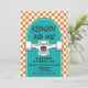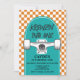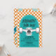 Invitación de cumpleaños con cheque naranja y patineta azul.
