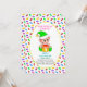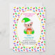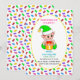 Tarjeta de invitación de cumpleaños del primer bebé y duende bebé con dulces multicolores sobre fondo blanco