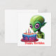 Esta es una imagen graciosa de una celebración de cumpleaños de un alien, con una torta y velas.
