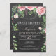 Invitación de cumpleaños elegante rústica de sweet 16 con rosas de peonía pintadas a mano de color rosa pálido y borgoña rojo con hojas y follaje verdes y con una fuente de caligrafía editable de moda y chic con letra manuscrita sobre un fondo oscuro de pizarra de carbón gris. +++++++++++ Adecuado para una fiesta de cumpleaños de dieciséis años de primavera, verano jardín u otoño / jardín trasero al aire libre / floral vintage.