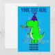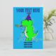 Dinosaurio de cumpleaños feliz adorable con confeti, sombrero y silbato. Invitación para fiestas infantiles. Edite el texto para personalizar.