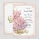 Invitación de baile de zapatillas de oro rosa con zapatillas de diamantes bonitas, vestido y tiara en un bonito fondo rosa y dorado. Puede cambiar el color del borde rosa y el color del texto. Estas invitaciones de fiesta de zapatillas de rosa y dorado se personalizan fácilmente para su evento simplemente agregando sus datos.