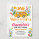 ¡Prepárate para una divertida celebración de primer cumpleaños con esta adorable invitación "One Happy Camper"! Con una linda camioneta amarilla rodeada de flores silvestres alegres, esta invitación es perfecta para una fiesta al aire libre. ¡Personalízala con los detalles de tu fiesta y prepárate para celebrar!