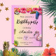 Este diseño llamativo presenta una explosión de flores exóticas coloridas, flamenco y loro juguetones, frutas exóticas y un toque de elegancia rosa. Perfecto para una fiesta de cumpleaños con tema tropical, esta invitación establece el ambiente para una fiesta divertida bajo el sol. ¡Personaliza los detalles de tu evento y que comiencen las festividades!
