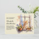 Invitación de cumpleaños para mujeres con la pintura de acuarela de un lindo gatito amarillo sentado en un alféizar con una caja de flores púrpuras.