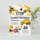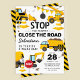 Invitaciones para fiesta de cumpleaños con tema de construcción con un simple fondo blanco, con ilustraciones de banderines de dibujos animados, señales de stop, un camión de volquete, una excavadora, un camión de cemento, una grúa de demolición, salpicaduras de tierra y una plantilla moderna para celebrar el cumpleaños infantil que es fácil de personalizar.