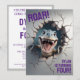 Invitación genial de cumpleaños para niños con un adorable bebé t-rex que rompe una pared para anunciar una celebración de cumpleaños dino-rrífica. Perfecto para el cuarto cumpleaños de un niño, pero la edad es editable.
