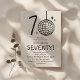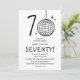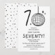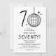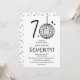 Cumple 70 años con estilo con nuestras invitaciones modernas y elegantes para el 70 cumpleaños. Nuestro diseño presenta una bola de discoteca dibujada a mano única que forma el '0' en el número 70, estrellas retro dispersas y una plantilla de fiesta informal en una fuente manuscrita emocionante, todo sobre un fondo blanco atemporal. Esta invitación especial fusiona diversión y elegancia, un verdadero reflejo de lo que significa cumplir 70 años.