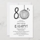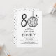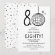 Cumple 80 años con estilo con nuestras invitaciones modernas y elegantes para el cumpleaños número 80. Nuestro diseño presenta una bola de discoteca dibujada a mano única que forma el '0' en el número 80, estrellas retro dispersas y una plantilla de fiesta informal en una fuente manuscrita emocionante, todo sobre un fondo blanco atemporal. Esta invitación especial fusiona diversión y elegancia, un verdadero reflejo de lo que significa cumplir 80 años.