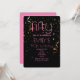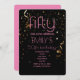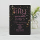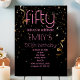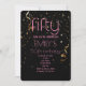 Invitación de cumpleaños 50 moderno con fondo negro y superposición de confeti dorado y texto rosa